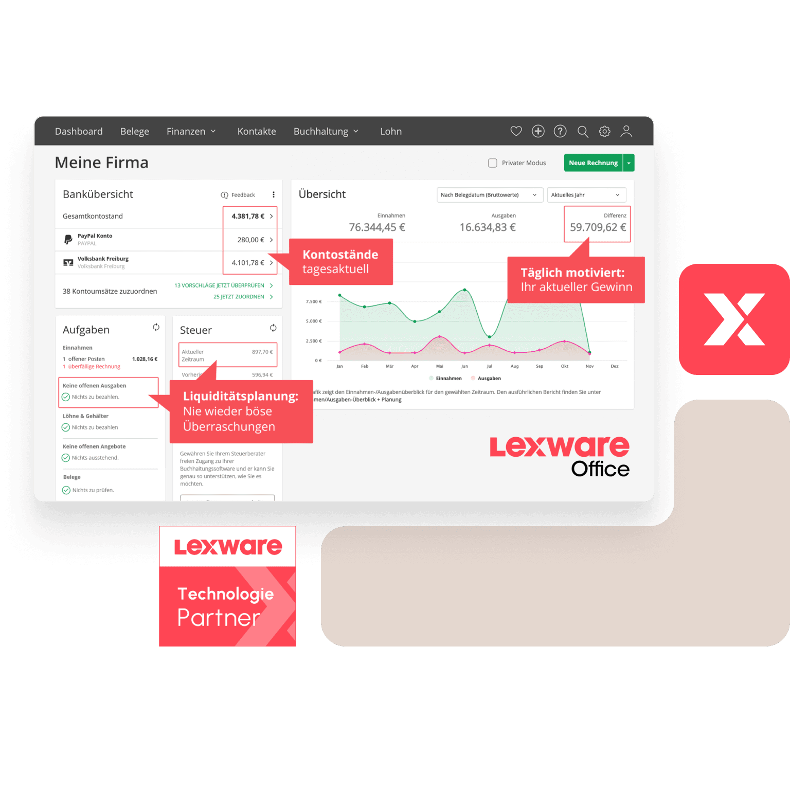Mit der Online-Unternehmenslösung Lexware Office erledigt sich Ihre Buchhaltung fast automatisch. Von der digitalen Belegerfassung über die Rechnungsstellung bis hin zur Buchhaltung in Sekunden. Dank integriertem Online-Banking mit automatischem Zahlungsabgleich sparen Sie sich das mühsame Vergleichen von Belegen und Kontoauszügen. Sie sehen sofort, welche Zahlung zu welchem Beleg gehört und haben immer den vollen Überblick. Lexware Office spart Ihnen so jede Menge Zeit.